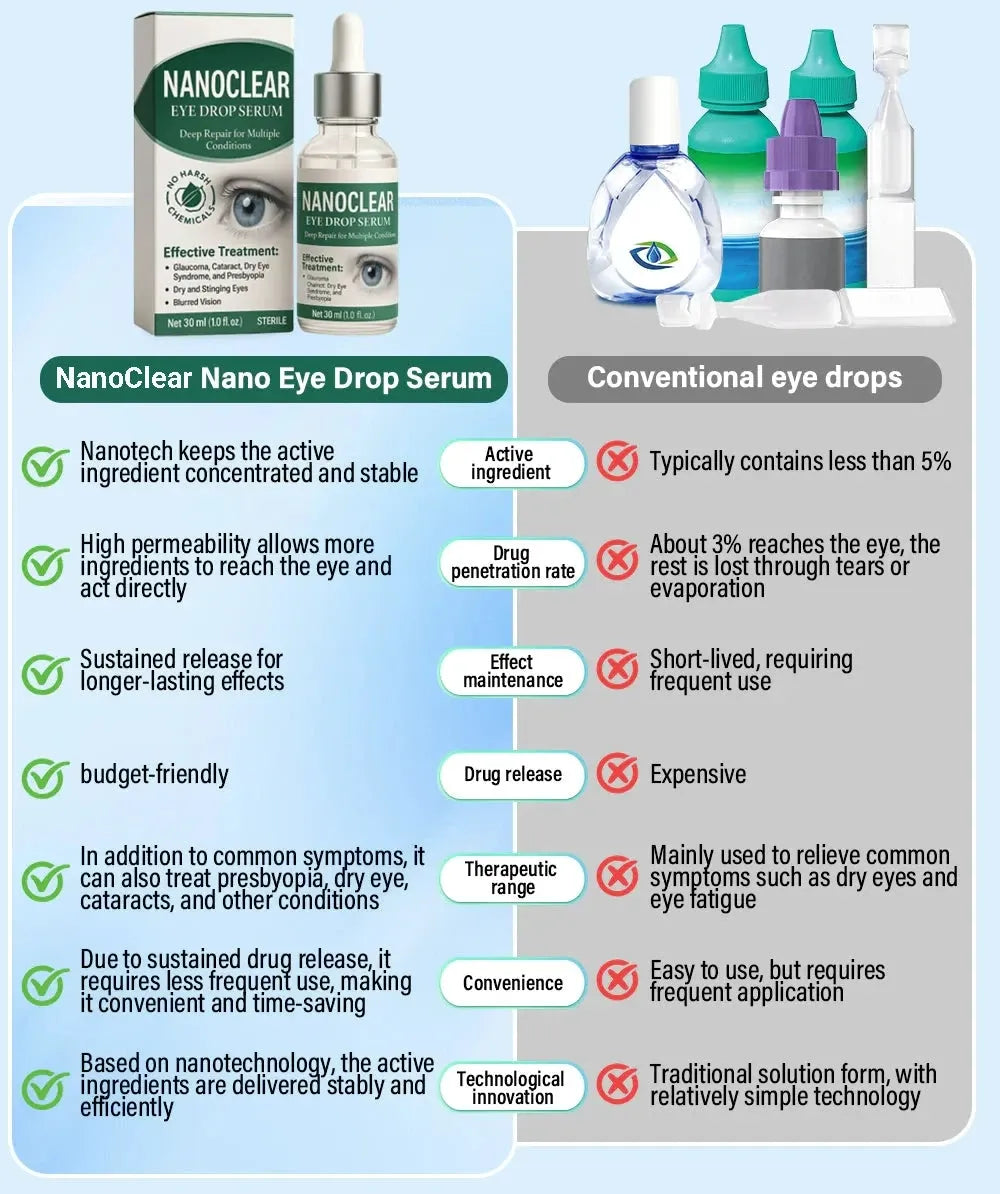 Those are temporary lubricants that sit on the surface. NanoClear's nano-shuttles actually deliver nutrients deep into your eye cells where age-related damage occurs.